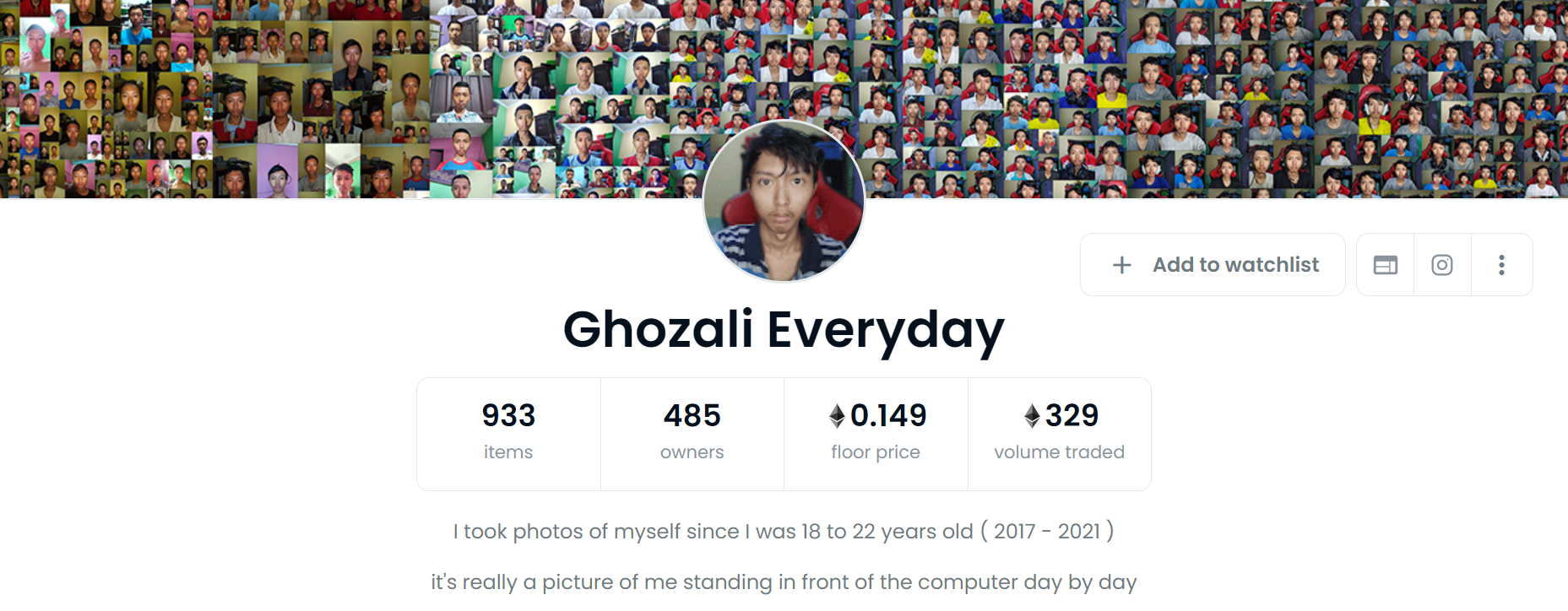 Sultan Gustaf Al Ghozali, a 22-year-old computer science student from Semarang, Indonesia, converted and sold nearly 1,000 selfie images as NFTs. According to Ghozali, he took photos of himself for five years — between the ages of 18 and 22 — as a way to look back on his graduation journey.