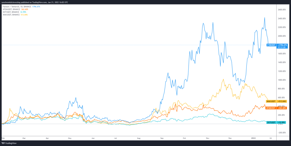 FTM/USDT vs. AVAX/USDT vs. ATOM/USDT vs. DOT/USDT daily chart. Source: TradingView