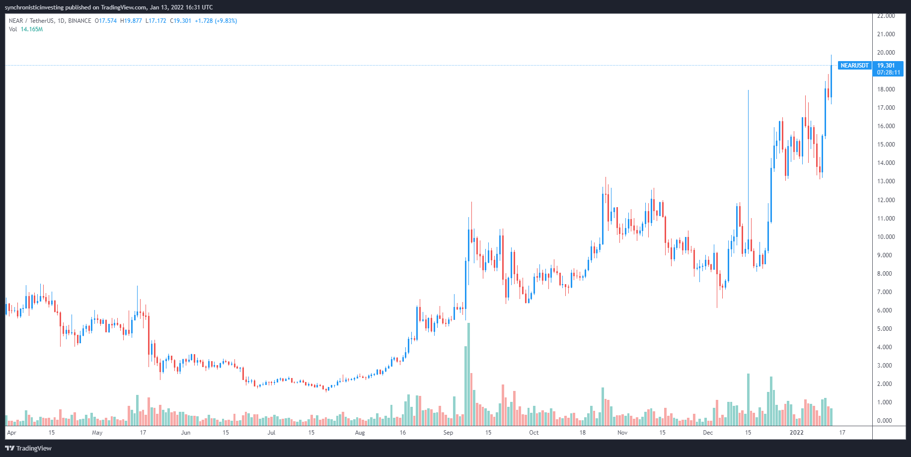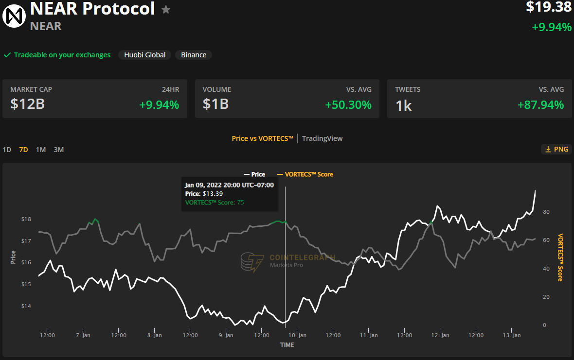 Data from Cointelegraph Markets Pro and TradingView show that, following a pullback that hit a low of $13.10 on Jan. 9, the price of NEAR climbed more than 50% to establish a new record high at $20.36 on Jan. 14.