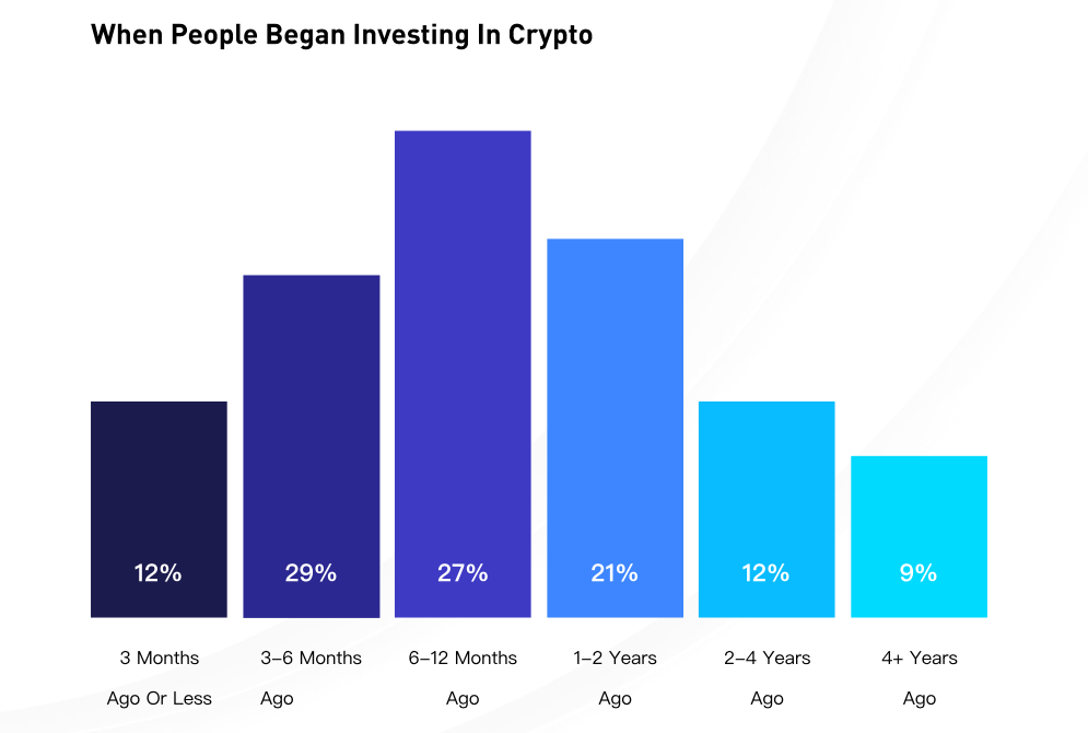 The survey found 68% of respondents got their first crypto exposure within the last year, while another 21% of those started investing in crypto up to two years ago. 12% of respondents made their first crypto investment within four years, while 9% began investing in crypto more than four years ago.