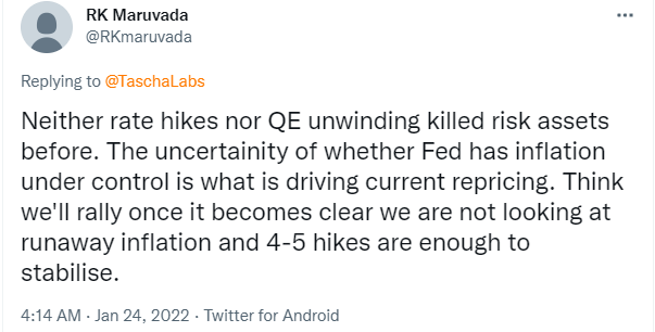 “Reversal of quantitative easing does. Check what happened to stocks 2015 and 2018 when Fed turned off the tap.”
