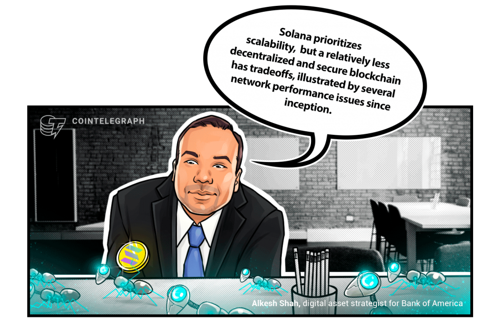 “Solana prioritizes scalability, but a relatively less decentralized and secure blockchain has tradeoffs, illustrated by several network performance issues since inception.”