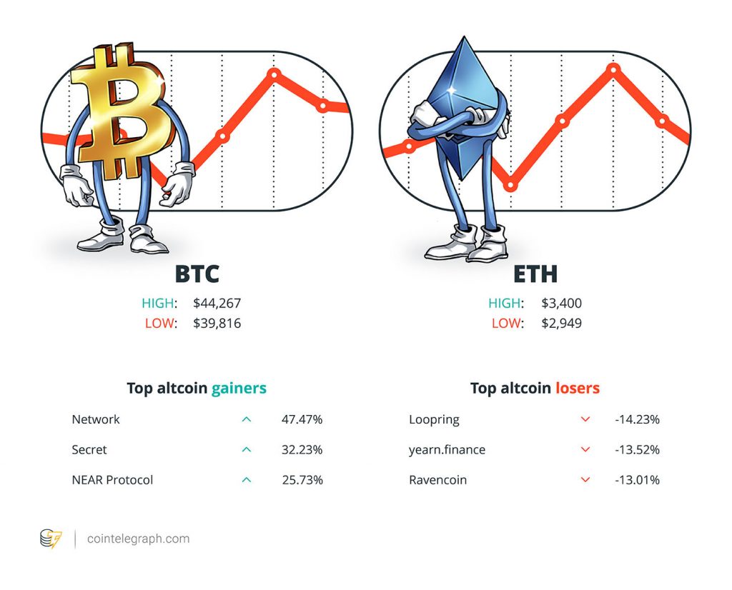 Bitcoin had somewhat of a rocky trading week, as the flagship cryptocurrency fell to a price of $39,675 on Monday, according to Cointelegraph’s BTC price index. BTC found itself priced at $44,315 by Wednesday. The asset hit $44,448 on Thursday before subsequently dropping later in the week.