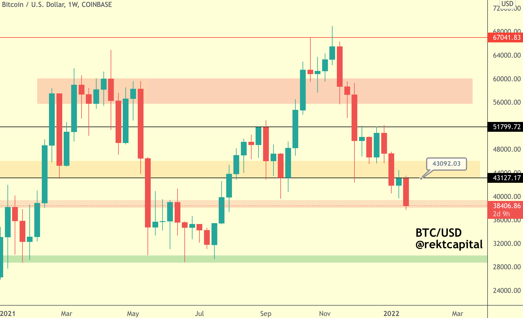 As shown in the following chart posted by Rekt Capital, “the recent BTC rejection means that BTC is now residing at the lower region of its current $38,000-$43,100 range.”