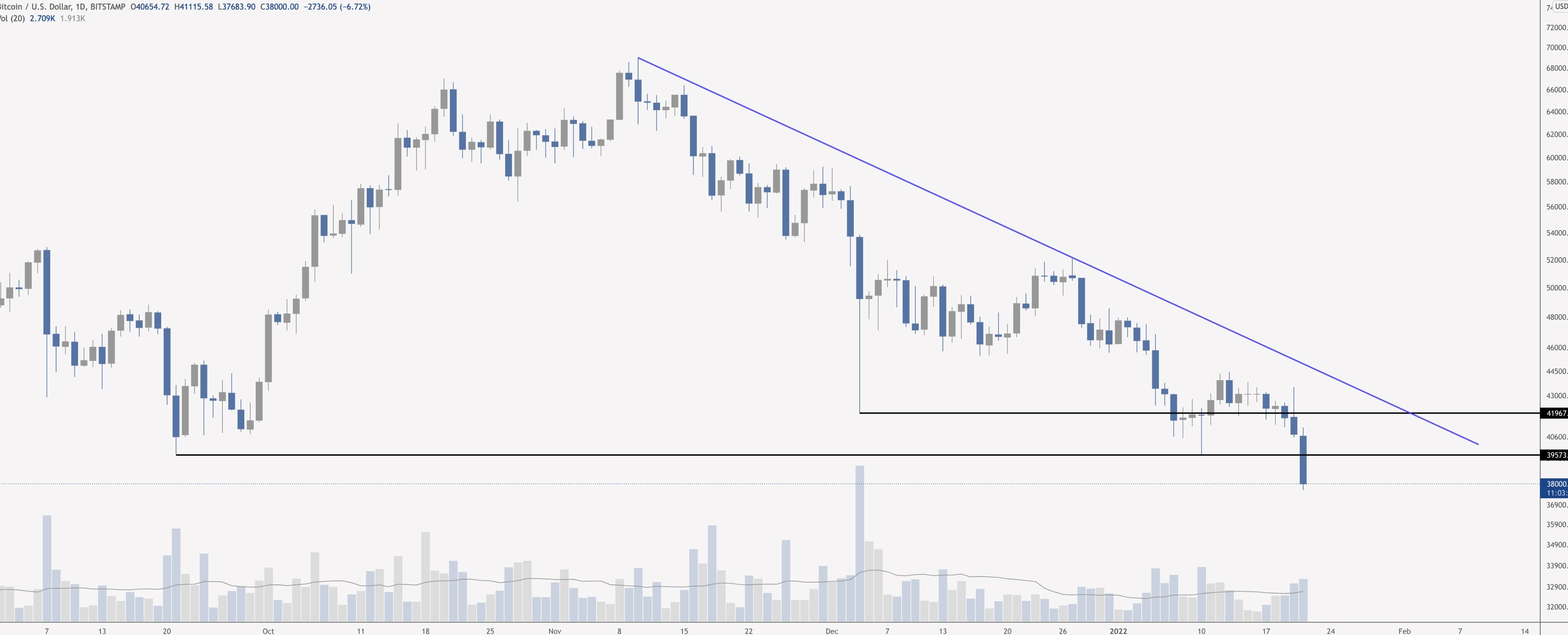 “Bulls looking for a Hail Mary close above $39,600 on the daily. A close below (especially on weekly) is a break in market structure, lower low etc. Bears showing no mercy.”