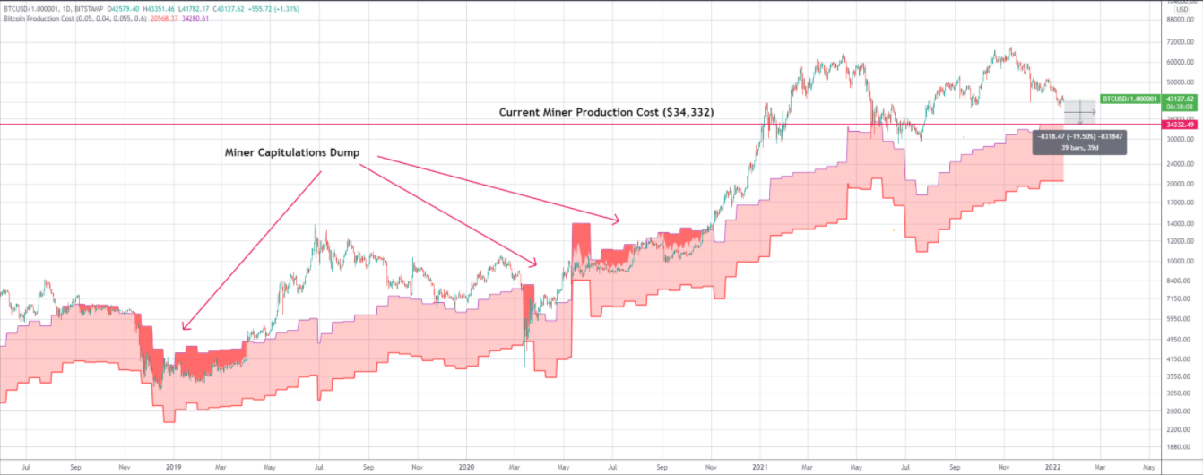 “The worst dumps Bitcoin ever had were due to miners capitulation (December 2018, March 2020), when BTC fell below production costs, it is at risk for miner capitulation,” he added in comments.