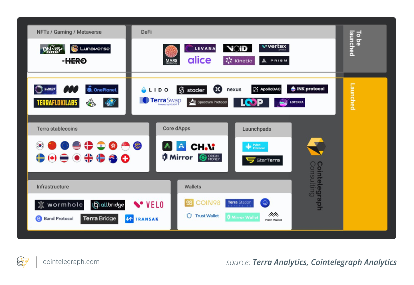 Following the core apps, multiple new projects have sprouted in the Terra ecosystem in the categories of gaming, metaverse, DeFi, nonfungible tokens and many others. There are also multiple cross-chain communication protocols that enable Terra assets to freely migrate to other chains. For instance, Solana bridge protocol Wormhole v2 facilitates asset transfers across Terra, Solana, Ethereum, BSC, Polygon, Avalanche and Oasis. This was made possible by Terra’s Columbus-5 mainnet upgrade.