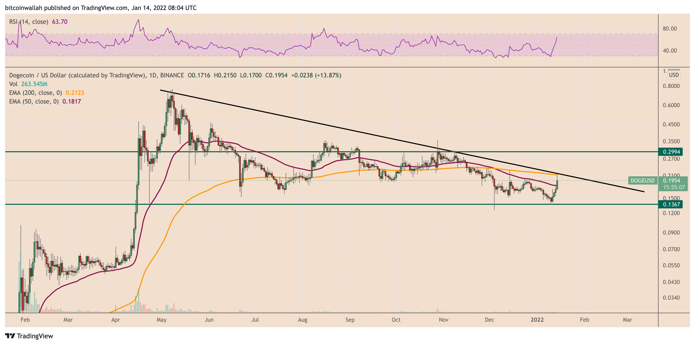 In detail, DOGE price rally was rammed into a descending trendline resistance that had been capping its upside attempts since May 2021. On Jan. 14, the trendline again became instrumental in sending DOGE from its intraday top of $0.2150 to $0.1958, as shown in the chart below.