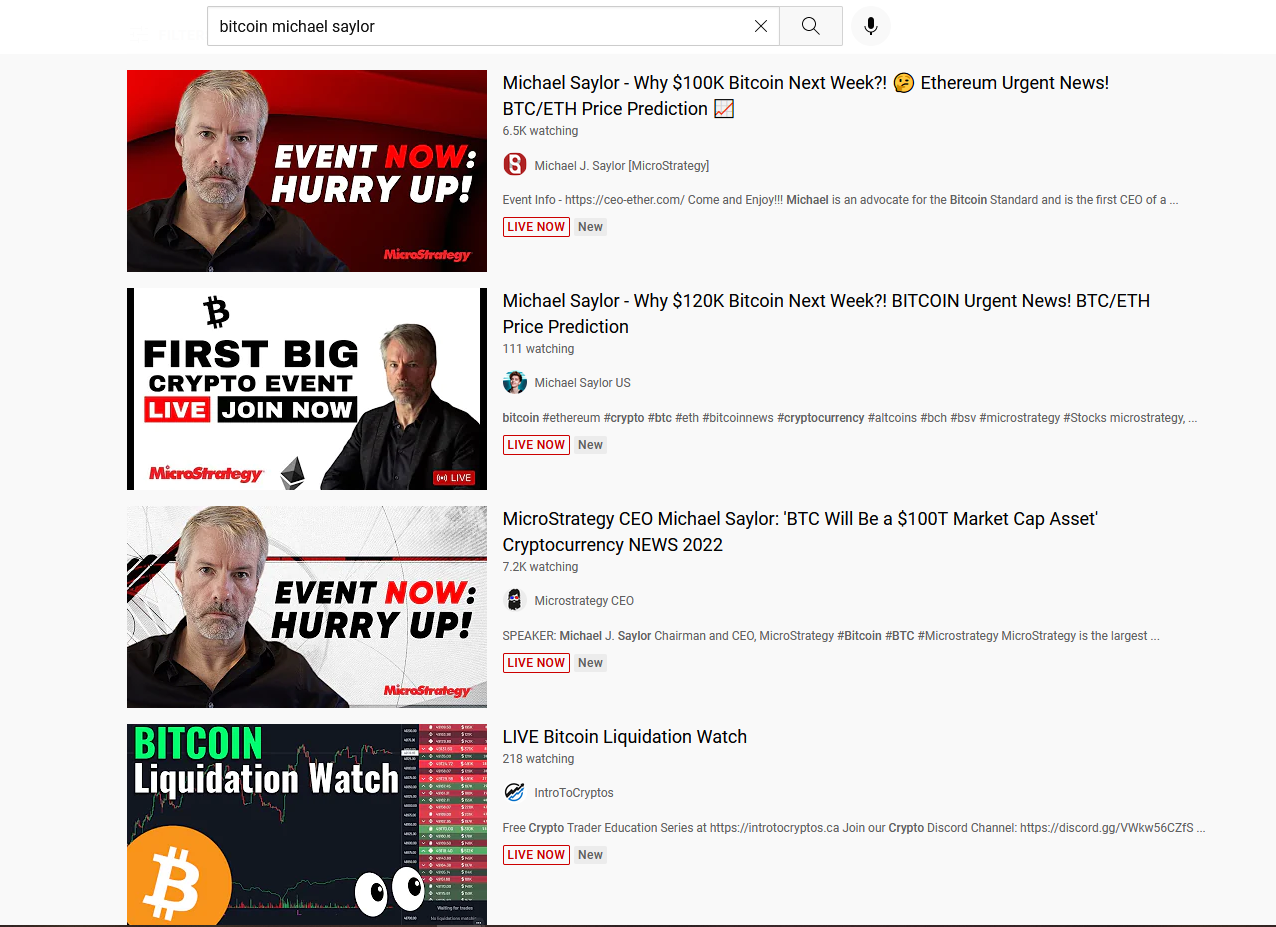 Despite its content policy, current searches on YouTube still yield results showing multiple live streams using the identity and video content of popular figures such as MicroStrategy’s Michael Saylor to promote dodgy websites and supposed “crypto giveaway” scams.