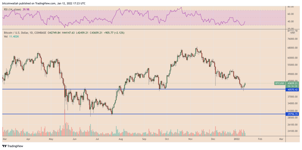 Many analysts predicted the decline to continue toward the $30,000 to $35,000 range, but the price reclaimed $40,000 as support again and on Wednesday BTC made an abrupt move above $44,000. This rekindled hopes that the $40,000 level is perhaps where Bitcoin may bottom out before continuing its move higher in 2022.