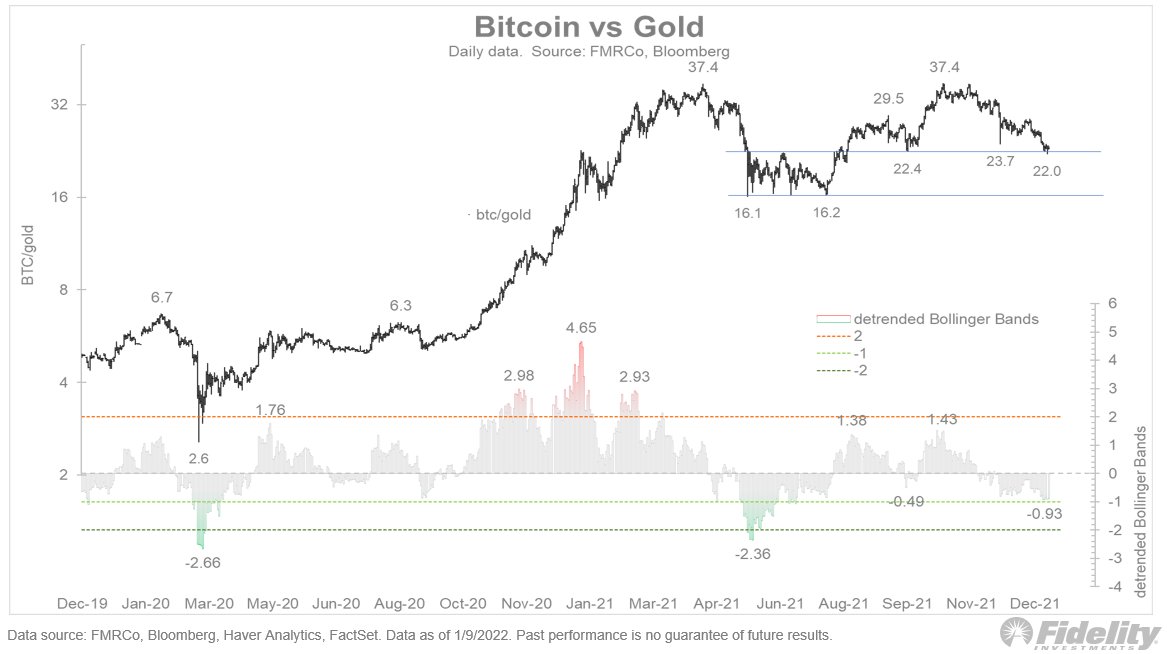 Bitcoin also appears oversold, albeit “moderately,” regarding its price-performance against gold. As Timmer noted, the so-called BTC/Gold ratio has slipped to support at 22 after topping out twice at 37.4 in 2021.