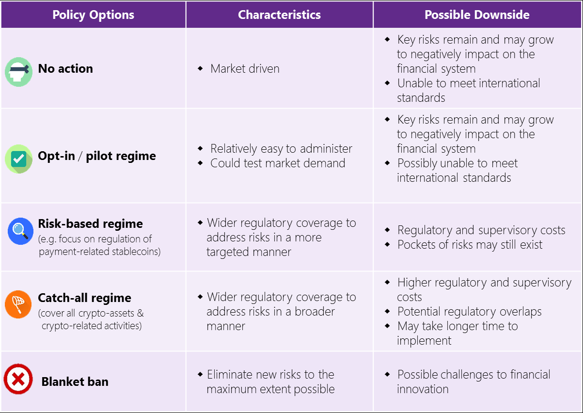 Based on the above figure, HKMA’s paper shows that the global market capitalization stood at about $150 billion in December 2021, “representing about 5% of the overall crypto-asset market.” The regulator has also shared a list of eight questions to seek policy-related recommendations citing five possible regulatory outcomes — no action, opt-in regime, risk-based regime, catch-all regime and blanket ban: