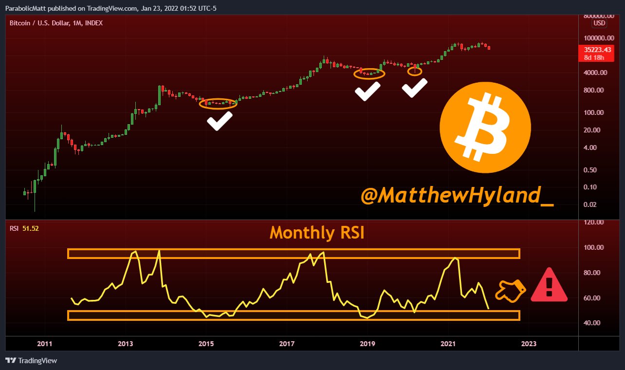 “Monthly RSI approaching levels that have been historically some of the best buying opportunities in its entire history,” fellow analyst Matthew Hyland added alongside a chart of his own.
