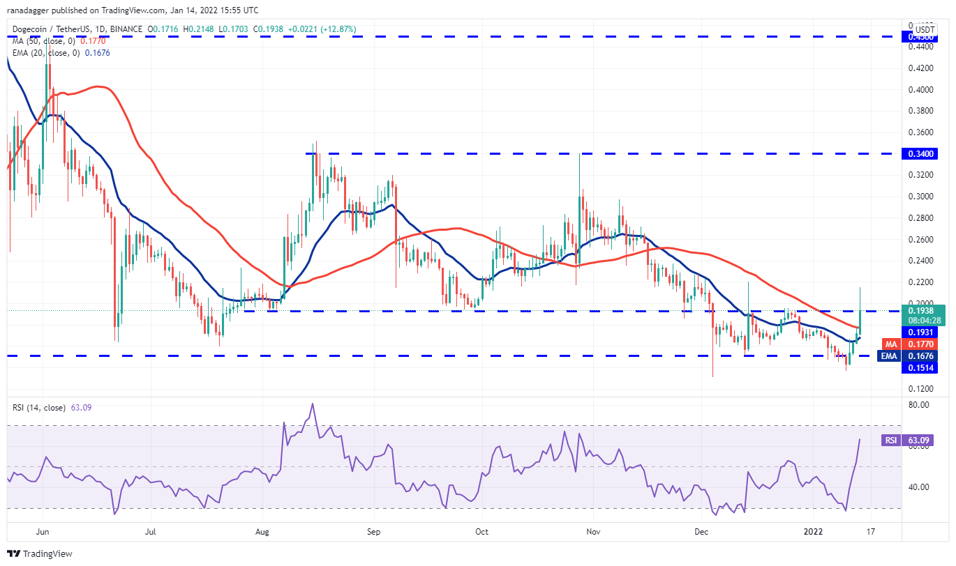 Dogecoin (DOGE) broke and closed above the 20-day EMA ($0.16) on Jan. 13, which was the first indication that the selling pressure may be reducing. That was followed by another sharp move today which pushed the price above the stiff overhead resistance at $0.19.