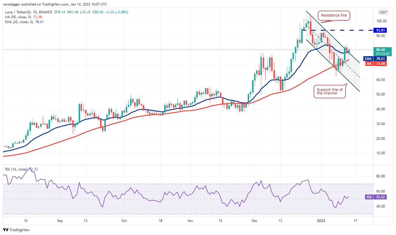 Terra’s LUNA token broke and closed above the resistance line of the channel on Jan. 12. The bears tried to pull the price below the 20-day EMA ($78.61) on Jan. 13 but failed. This indicates that bulls are defending the support aggressively.