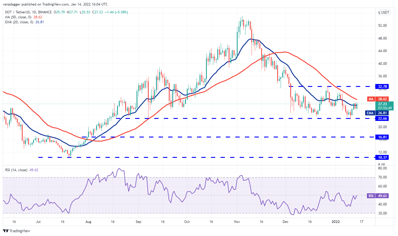 Polkadot (DOT) turned down from the 20-day EMA ($26.81) on Jan. 13 but the positive sign is that the bulls did not give up much ground. This indicates that bulls are viewing the dips as a buying opportunity.