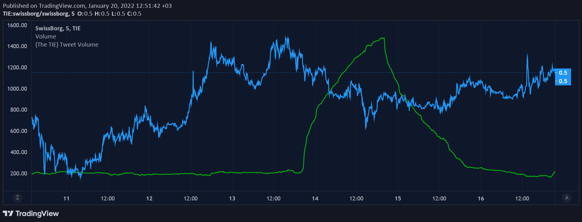 While the price of SwissBorg Token (CHSB) remained in a rather narrow range between $0.52 and $0.57 throughout last week, there was a 521% increase on Jan. 14 in the volume of tweets that mentioned SwissBorg. What was the reason for the uptick? A Jan. 13 giveaway of whitelist spots for nonfungible token (NFT) mints that required liking and retweeting the original post to enter. Having reached upward of 13,000 retweets, it was a successful publicity move, but it had had little effect on the CHSB token’s price, however.