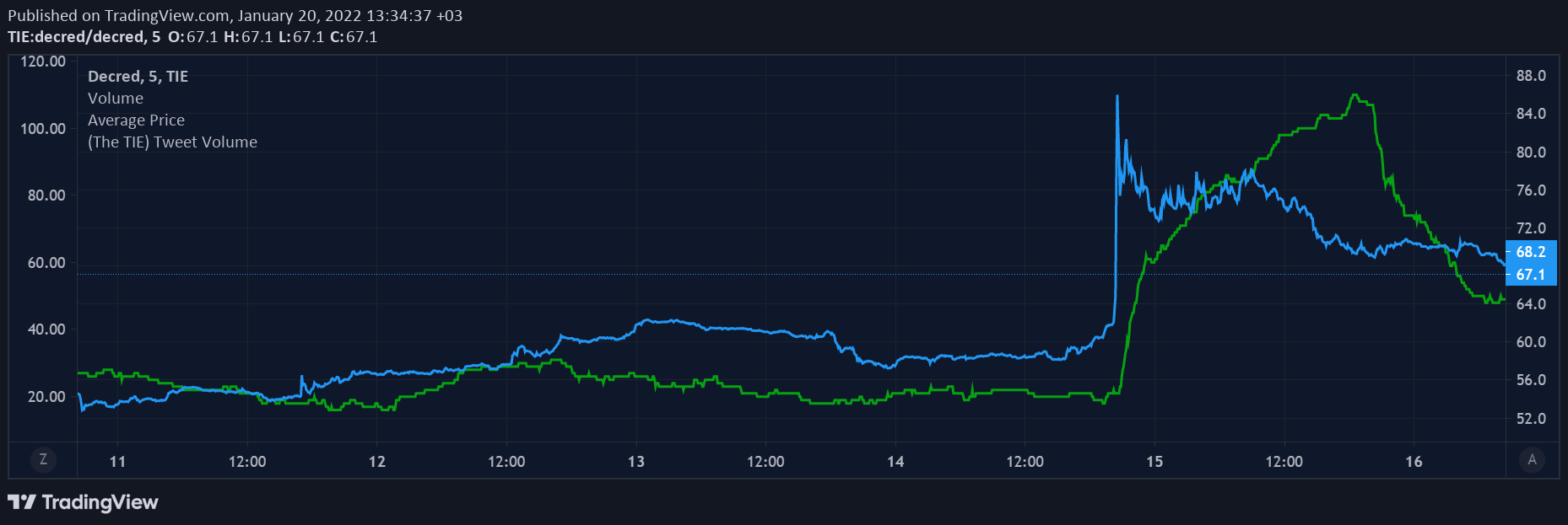 One common scenario is an explosion of Twitter attention in response to a dramatic price hike. A case in point is the price of Decred (DCR) vs. its tweet volume last week. Late on Jan. 14, the coin’s market value shot up from around $60 to $86 in a matter of three and a half hours. Social excitement began building up only after the price peak, culminating in a high of 110 tweets the day after, when the price had already corrected to below $70.