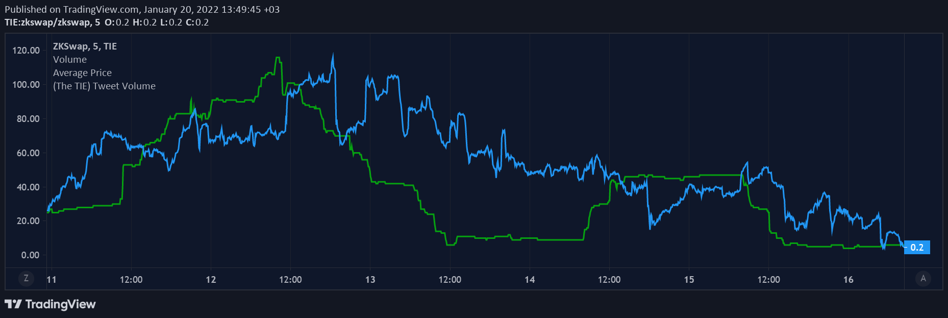 Early in the week, ZKSwap’s ZKS token saw a modest price increase from $0.27 to $0.29, with the tweet volume peak of 116 posts coming on Jan. 12, ahead of the week’s price high. Although it does not look humongous, this attention spike marked a 370% increase in tweets compared with the week before.