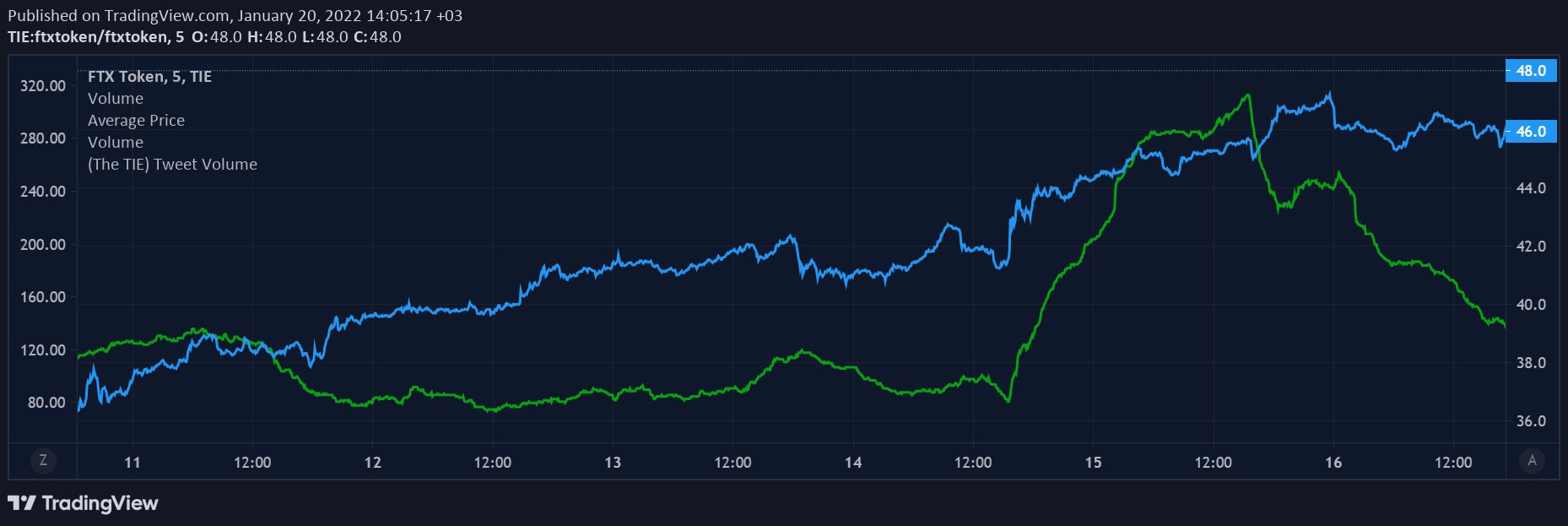 FTX Token (FTT) had a strong week in terms of price movement, steadily climbing from $36.81 on Jan. 10 to $47.02 on Jan. 16. The asset’s spectacular run didn’t go unnoticed by Crypto Twitter, as the volume of conversation ramped up on Jan. 14 and reached its high-water mark the next day with 313 tweets. FTT’s solid performance continued even after tweet volume peaked. In this case, a spike in social attention could have certainly alerted traders to a profit opportunity.