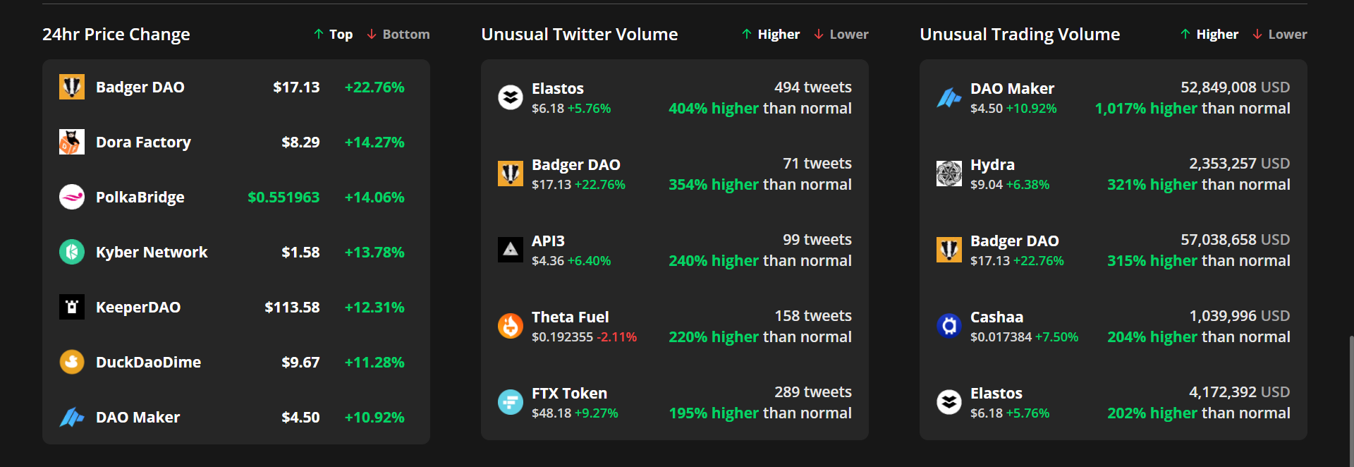 CREAM, the native token of decentralized finance project Cream Finance, sported the greatest week-to-week tweet volume increase as conversation around the asset grew 543% more extensive. The reason for the popular excitement was the announcement that holders could stake their CREAM to receive the tokens of the upcoming Iron Bank, Cream Finance’s new protocol-to-protocol lending platform.