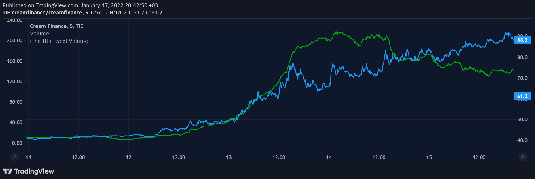 As visible in the chart, the price hike that began to unfold on Jan. 13 went hand in hand with the intensifying tweetstorm. The discussion peaked on Jan. 14 when 216 tweets referencing CREAM were posted, against a price of around $72. Even as the chatter began to recede, the token continued to add value, breaching $92 on Jan. 15. In this case, the Twitter trend was clearly instructive, as CREAM’s price grew an additional 27% over the two days that followed the tweet volume peak.