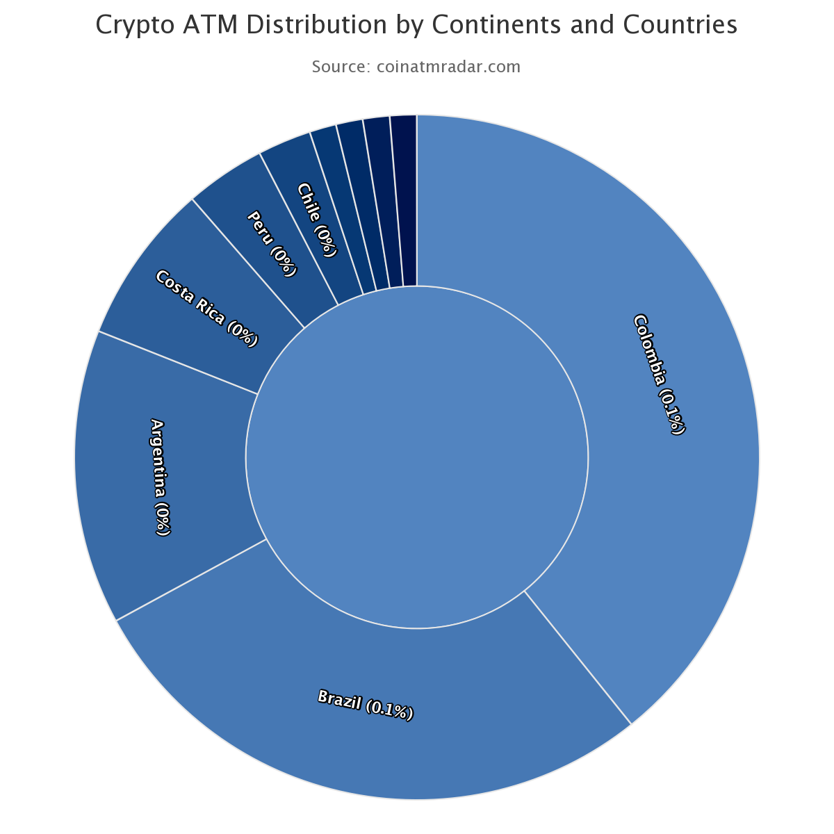 Data from Coin ATM Radar shows that Colombia leads the South American market with 31 crypto ATM installations to date, who is followed by Brazil and Argentina at 22 and 11 installations respectively.